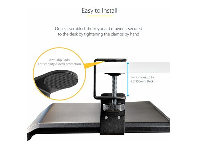 KEYBOARD-TRAY-CLAMP1 - StarTech.com Under-Desk Keyboard Tray, Clamp-on Keyboard Holder, Supports up to 12kg (26.5lb), Sliding Keyboard and Mouse Drawer with C-Clamps, Height Adjustable Keyboard Tray